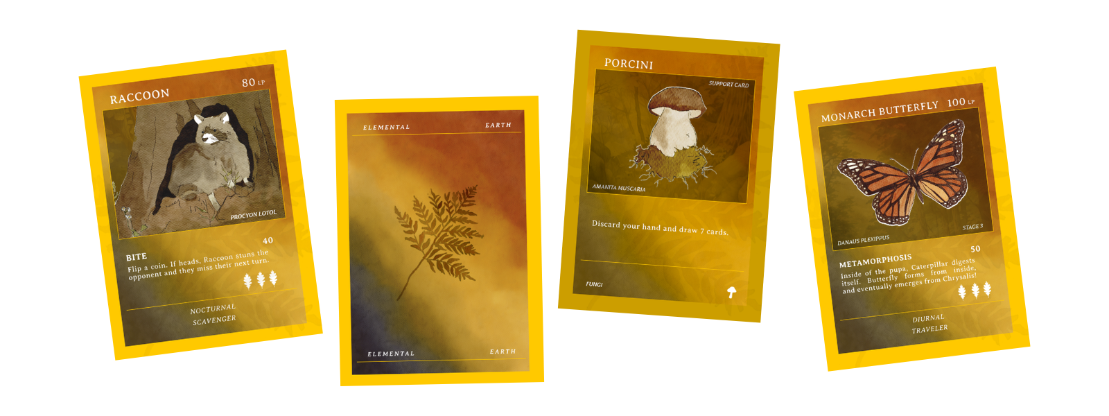 There are 4 types of cards in Pocket Forest. Animal, Elemental, Support, and Quest.