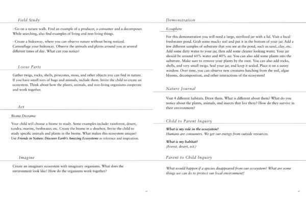 There is an art project for every topic. The supplies are very minimal, and can mostly be found in nature. Invite your child to decorate their room or your homeschool room with their projects.