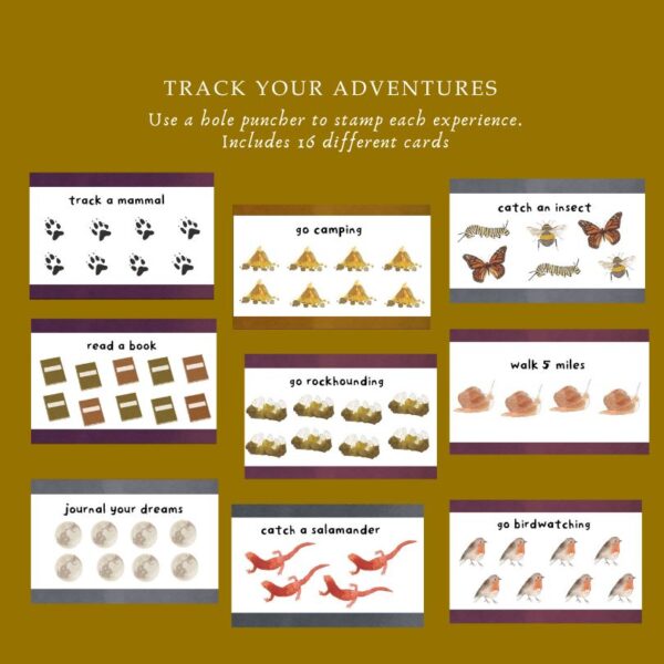 Invite curiosity and track your adventures in nature with these Forest School Punch Cards! Use a hole puncher to punch out a stamp when you have completed an experience. This listing includes 16 unique punch out cards.
