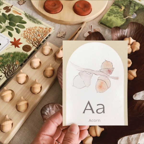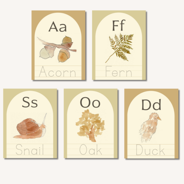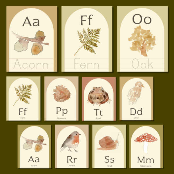 26 Nature Alphabet Flash Cards in two sizes, small (4.25 x 5.5 inches) and large (5.5 x 7.12 inches)