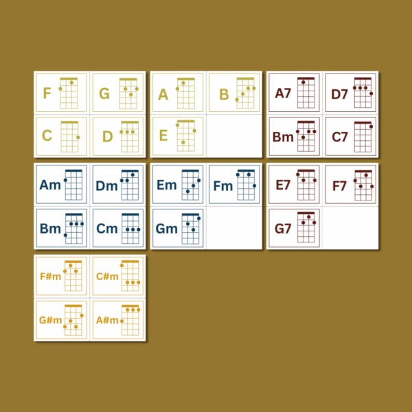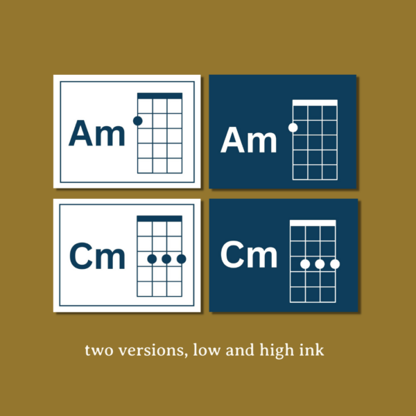 Learn the ukulele with these chord chard flash cards! Comes in two versions, color or white background for eco-friendly printing. You will receive an instant PDF download. This file is for personal use only, redistribution is not permitted.